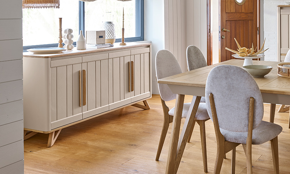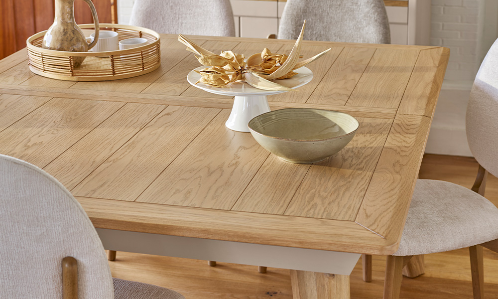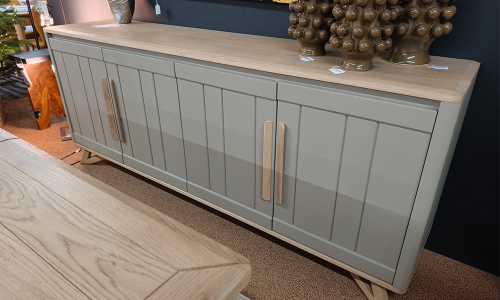 Intérieurs et extérieur laqué (côtés, portes, tiroirs) en épicéa. Dessus, poignées, rives planchers, tablettes et pieds chêne massif. Grandes tables chêne massif ou médium plaqué pour allonges. Fabriqué en France.