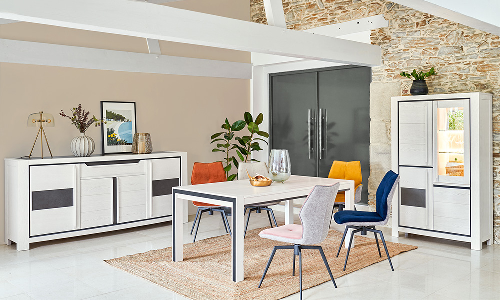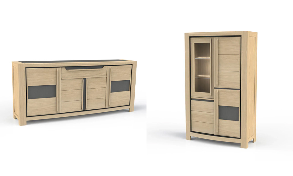 Meubles panneaux de fibres et particules moyenne densité revêtus de placage chêne avec incrustation céramique et poignées en chêne massif.