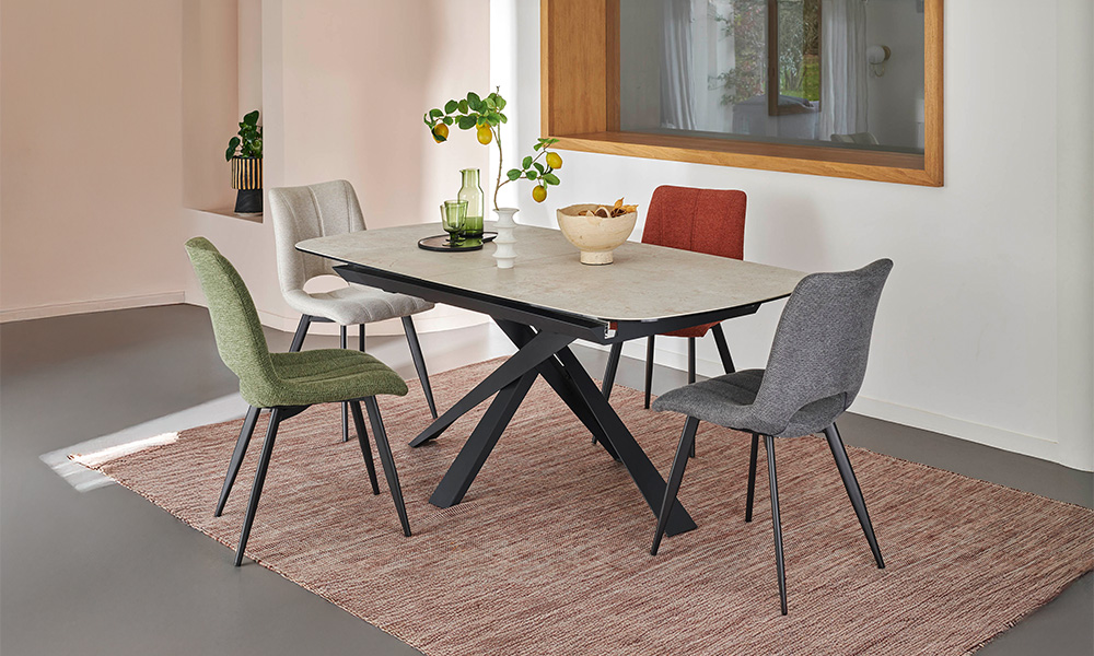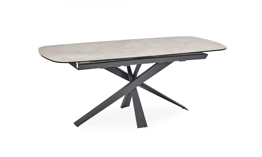 Plateau céramique 11 mm. Céramique collée sur verre 8 mm. Piètement fer entremêlé trapèze.